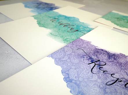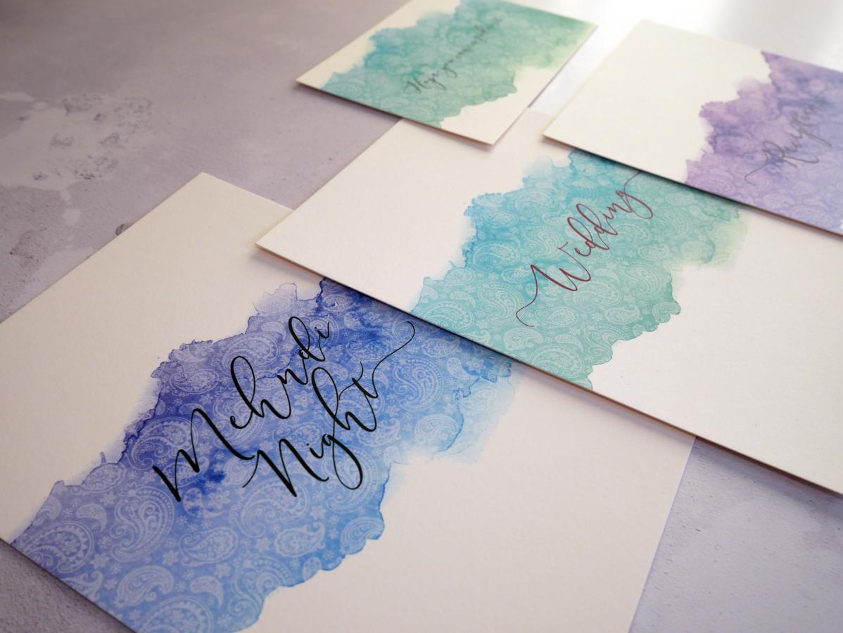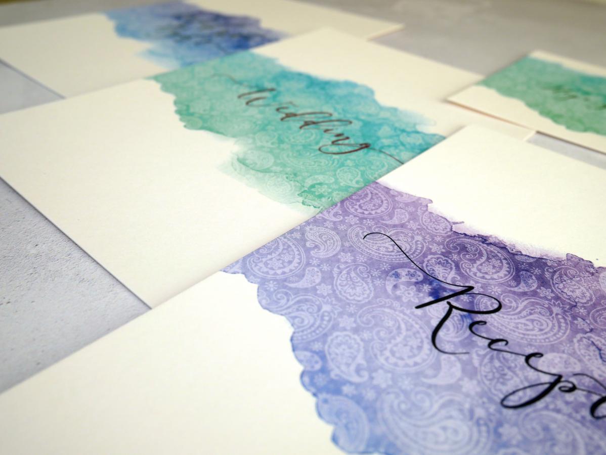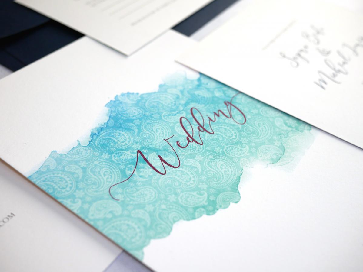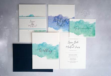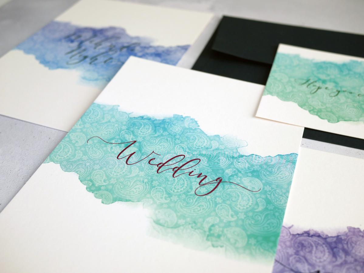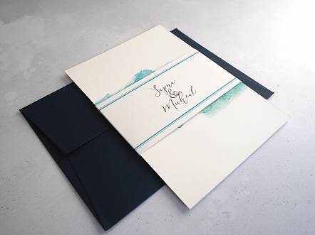 Each invitation includes a single 'wedding' insert, belly band and coloured envelope.
